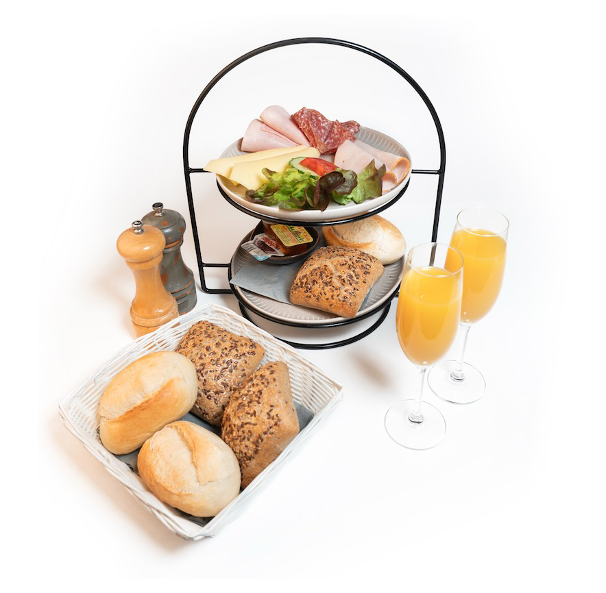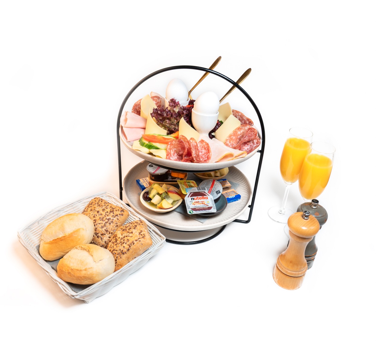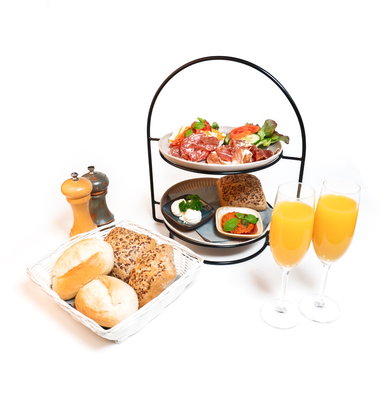 ZWEI GLÄSER PROSECCO ODER ZWEKGLÄSER FRISCH GEPRESSTER O-SAFT, FRISCHES OBST, FRISCHKASE, BERGKÄSE, GOUDA, SALAMI, KOCHSCHINKEN, ZWEI GEKOCI ITE EIER, MARMELADE, NUTELLA, HONIG UND BUTTER SERVIERT MIT EINEM BROT-BRÖTCHEN-KORB