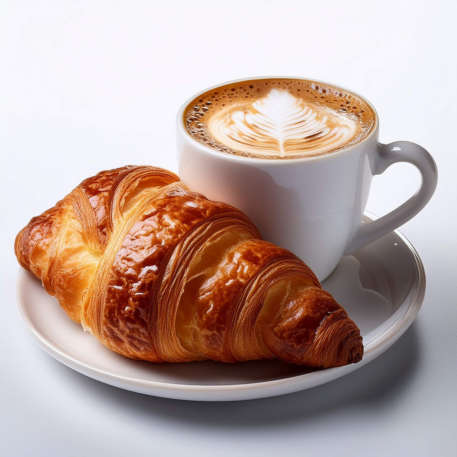 CROISSANT, BAGUETTE, BUTTER, MARMELADE, HONIG, PETIT BRIE UND EINEN CAFÉ AU LAIT